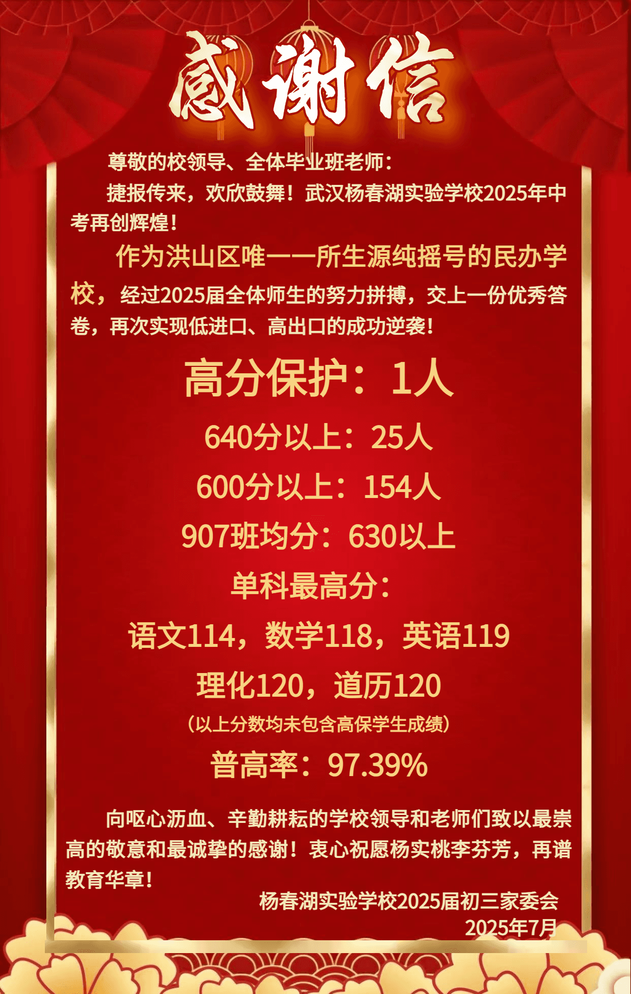 九年级的九大名高上线率、省示范上线率、普高上线率、优秀率、及格率、平均分等各项指标均居洪山区第一。